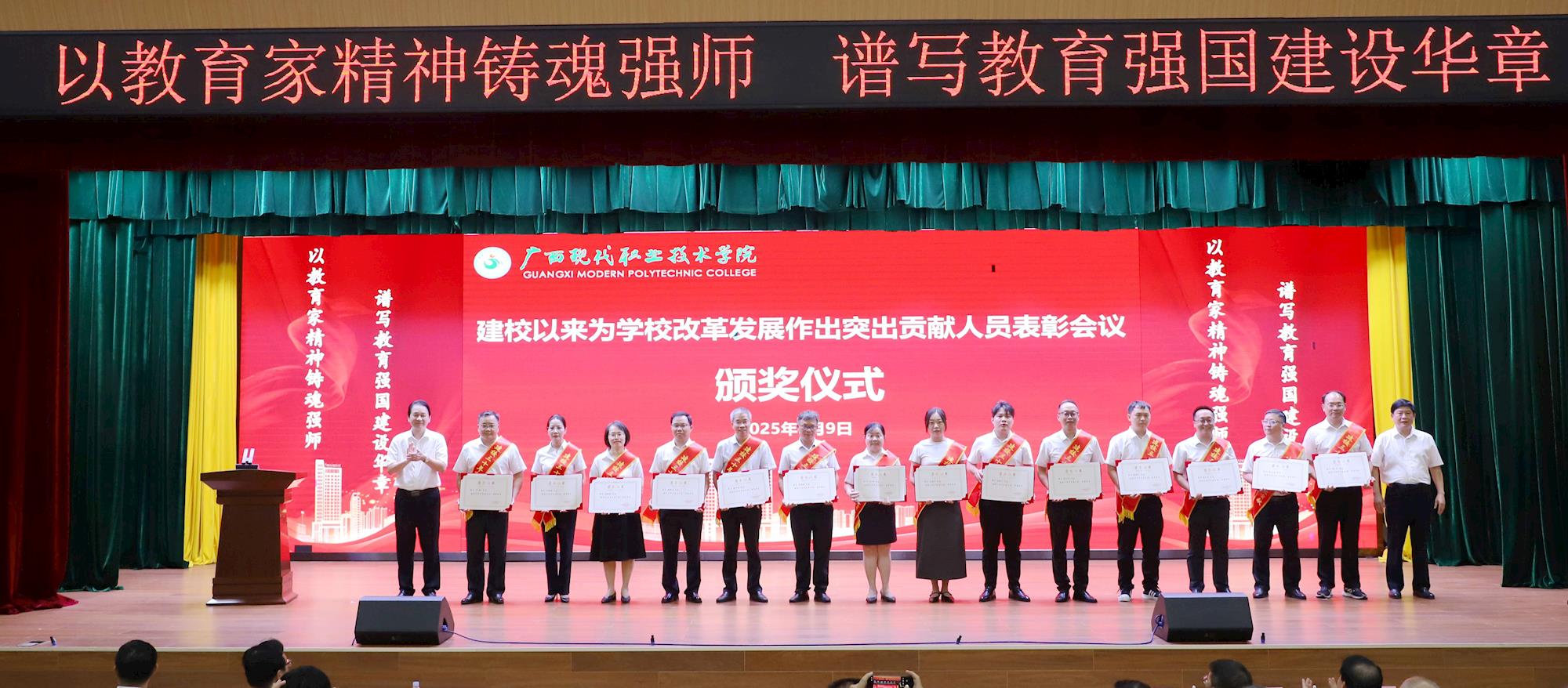 表彰大会庄重感人。大会首先追授杨森林、卢中炎、韦安成、覃焱包、朱新民5位已故同志 “建校30周年突出贡献奖”,现场由其亲属代为领取荣誉证书和鲜花,以此缅怀逝者、铭刻建校先驱精神。随后,韦书记为田景章、覃志航、潘尚河等15位退休教职工代表颁发“建校以来突出贡献奖”,表彰他们为学校建设和发展付出的辛勤努力。他们将毕生精力奉献给学校,其奋斗历程就是学校发展史的生动写照。